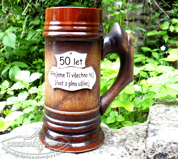 Keramický korbel s číslem "50 let" a nápisem "Přejeme ti všechno nej, život z plně užívej."