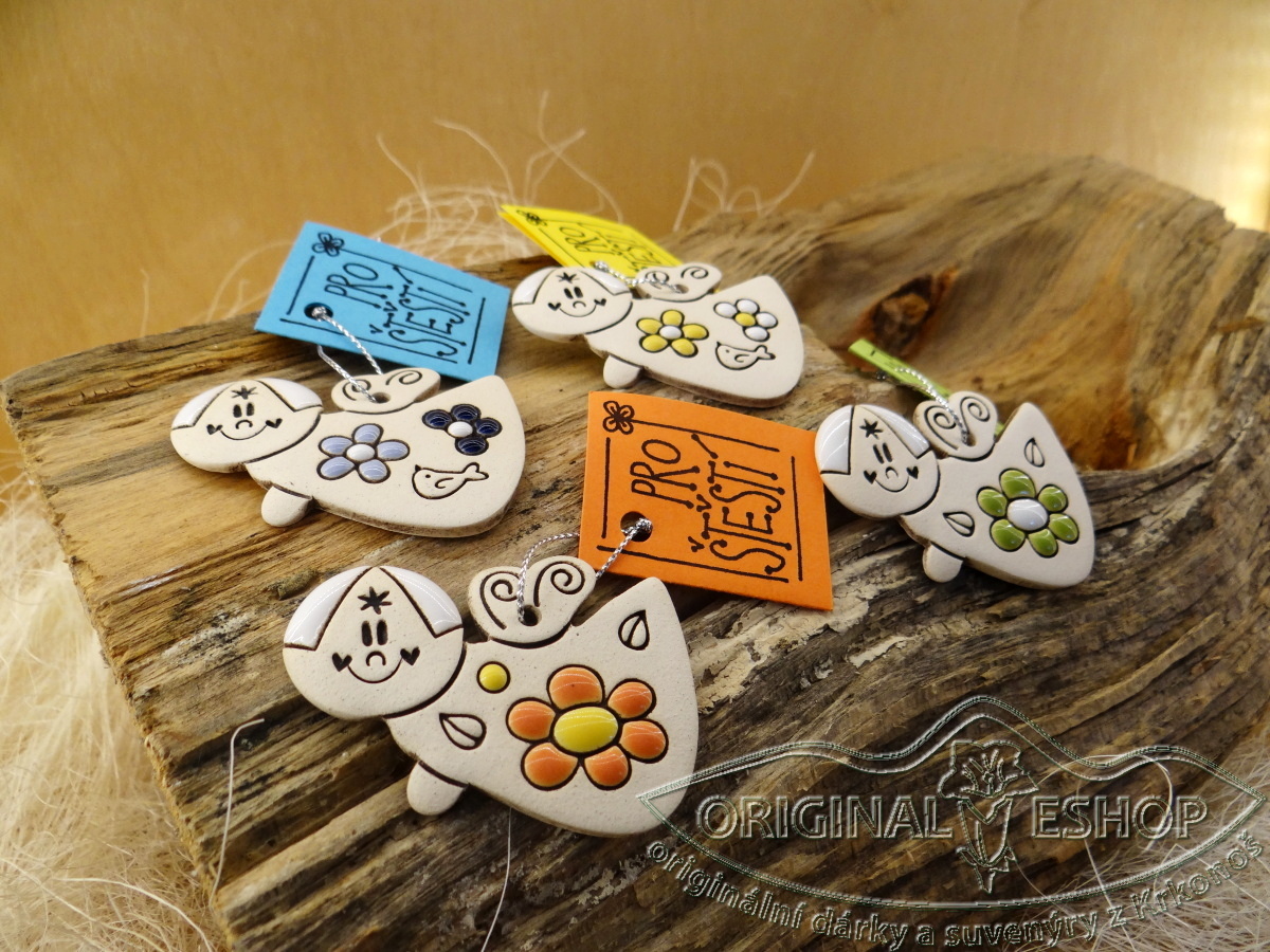 Ručně malovaný keramický andílek s cedulkou "pro stěstí" v barevném pytlíčku.