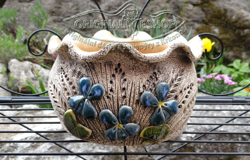 Originální keramický buclatý obal na květiny s fialkami.
