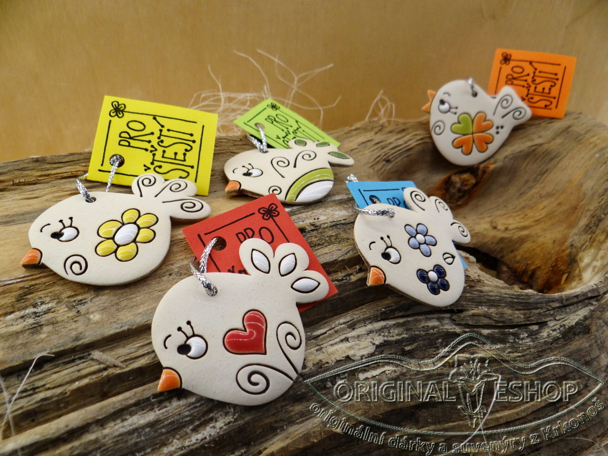 Ručně malovaný keramický ptáček s cedulkou "pro štěstí" v barevném pytlíčku.