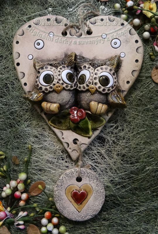 eRučně vyrobené keramické srdíčko se sovičkami na zavěšení .